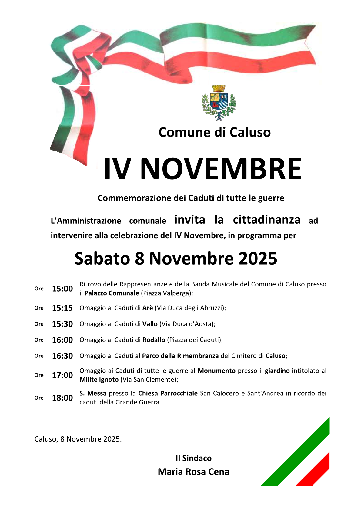 LโAmministrazione Comunale di Caluso invita tutta la cittadinanza a partecipare alla Commemorazione dei Caduti di tutte le guerre, in programma sabato 8 novembre 2025.
